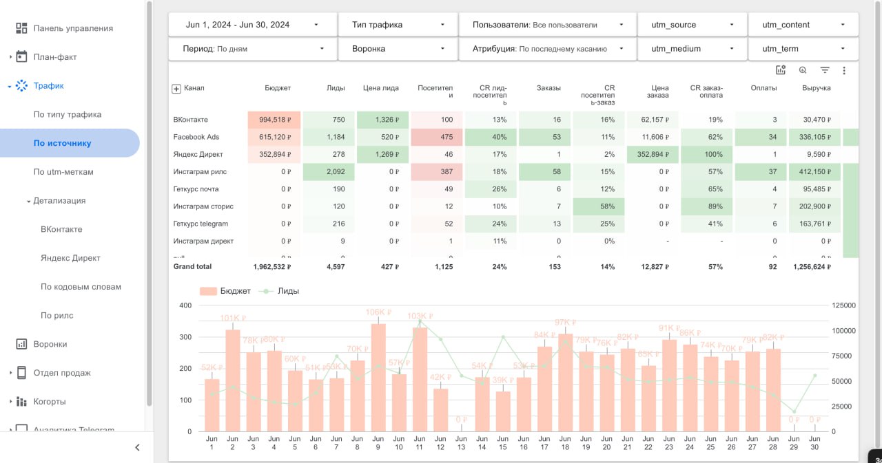 Спроектировали структуру хранилища, настроили выгрузку данных из рекламных систем и GetCourse, собрали отчеты